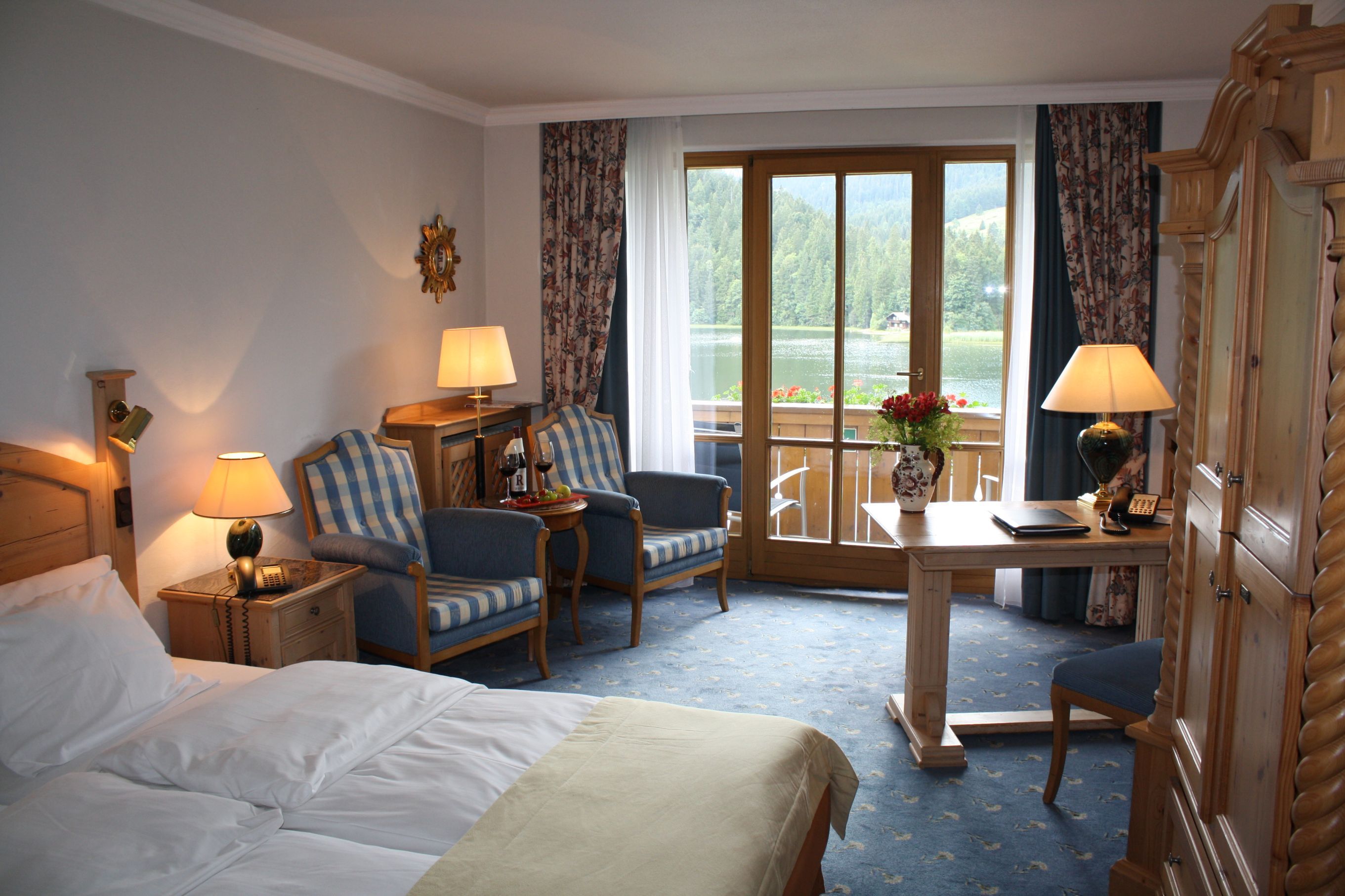 Zimmer mit Seeblick im Arabella Alpenhotel am Spitzingsee.